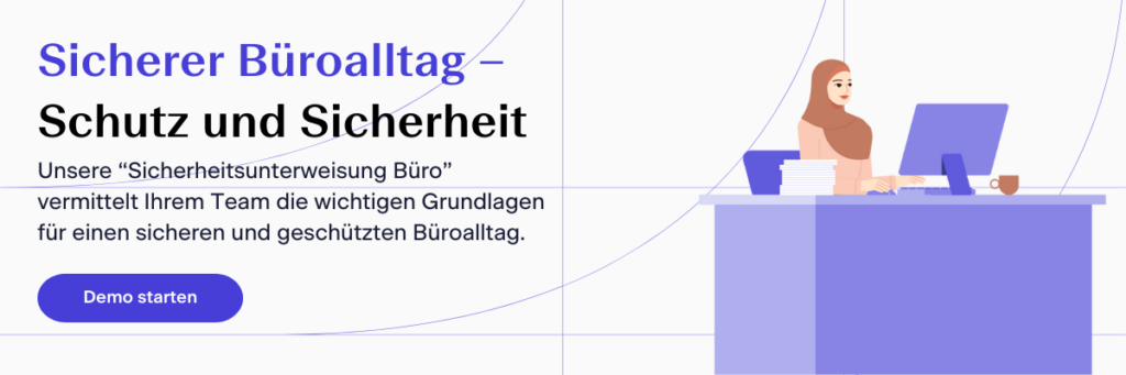 Die Sicherheit der Mitarbeitenden hat nicht nur in produktionsorientierten Umgebungen, sondern auch im Büro, die höchste Priorität. Unsere Sicherheitsunterweisung „Arbeitsschutz im Büro“ wurde speziell entwickelt, um Ihre Belegschaft sowohl am Arbeitsplatz als auch auf dem Weg dorthin umfassend zu schützen.