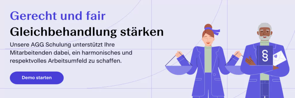 Ein angenehmes und gleichberechtigtes Arbeitsumfeld wünschen sich die meisten Mitarbeitenden nicht nur, sie haben mit dem AGG auch einen gesetzlichen Anspruch darauf. Unser innovatives E-Learning zeigt Ihren Mitarbeitenden, wie eine harmonische Zusammenarbeit ohne Diskriminierung gelingt.